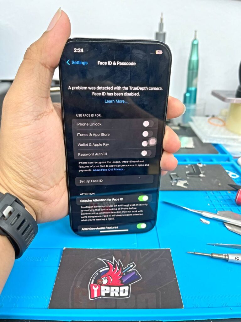 Kemudian, masalah seterusnya adalah Face ID tak boleh pakai. Masalah Face ID rosak ini berkait dengan Ribbon Dot Projector (RDP). RDP ini akan memancarkan dot infrared pada muka kita dan sahkan muka pengguna. Jadi secara keseluruhan kami telah repair iPhone ini dengan menukar 2 komponen. iPhone boleh dihidupkan semula dan kami juga berjaya repair Face ID iPhone ini. Proses untuk repair iPhone stuck Apple logo ini adalah 1 jam sahaja. Anda boleh hubungi kami melalui Whatsapp 0196000508 atau social media iPro Ampang. Dapatkan quotation harga atau booking session sebelum datang ke kedai. Terima kasih diucapkan kepada semua kerana percayakan servis repair iPhone kami.