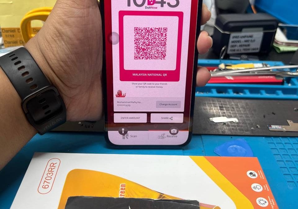 Kemudian, kami memindahkan komponen pembesar suara telinga ke skrin OLED iPhone yang baru. Selepas itu, skrin OLED dipasang dan kami menjalankan ujian penuh pada peranti tersebut. Ini adalah untuk pastikan skrin berfungsi sepenuhnya tanpa sebarang masalah. Akhir sekali, semuanya berfungsi dengan baik dan iPhone dipasang semula. Kami pun menyerahkan kembali iPhone kepada beliau dalam keadaan berfungsi sepenuhnya. Kesimpulannya, kami berjaya tukar skrin iPhone dalam masa 30 minit seperti yang dijanjikan. Beliau juga membuat bayaran sejurus memastikan skrin iPhone ini berfungsi. Jika anda memerlukan pembaikan yang pantas dan boleh dipercayai, kedai baiki iPhone kami sedia membantu anda untuk sebarang pembaikan, termasuk repair iPhone cannot on dan iPhone motherboard repair.